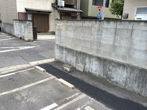 さか枝店舗の北西4区画のみの駐車場へ、空いてる!ラッキー!って思って駐車しようとしたら、いつものさか枝ブロックがありません。