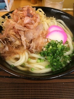 このうどんは、実は月見うどんですが、鰹節に隠れて、黄身が見えません。