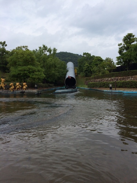 ただもっとも興奮したのが、いや興奮というよりも恐怖だったのが、「吉野川くだり」というアトラクションでした。パッと見の雰囲気が、丸太のボートに乗って、ゆ〜たりと川を流れて、しょーもないたぬきのオブジェでも眺めて帰ろうかぁ〜というものでした。こういう印象だったので、そのギャップが激しかったからかもしれませんが、川を下る途中の、下るといっても平坦な水面をゆっくりと滑っているだけなのですが、いきなり急勾配の坂が現れて、登って急降下して水しぶきを撒き散らします。