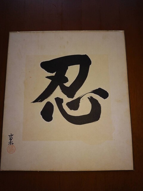 今から40年前に、色紙に書かれた「忍」という一文字です。実家から発見されました。