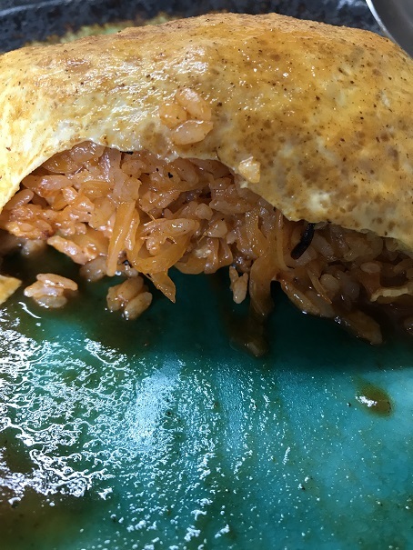 調理過程において、使い古した黒いフライパンに、コンッ!と、