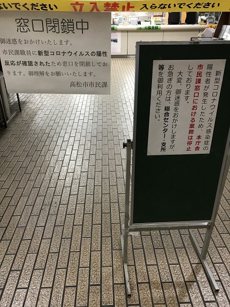 コロナの影響で、高松市役所の一階の窓口が封鎖されていました。