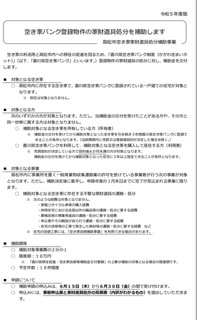 高松市役所の家財道具処分への補助金の説明のサイトをここに置いておきます。