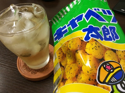 ウィスキーのソーダ割に、キャベツ太郎のソース味がよくあいます。