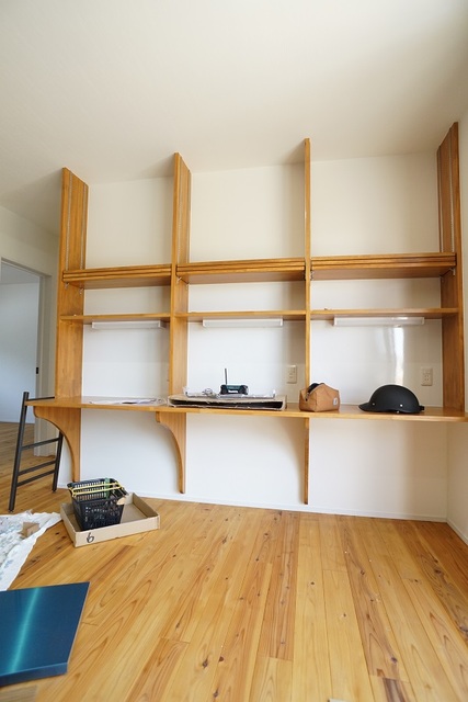 この三姉妹のための、造作した勉強机アーンド収納棚です。