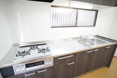 キッチンが渋い色です。外壁もツートーンで渋めでね。