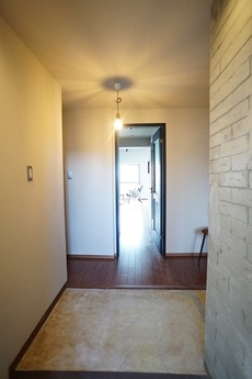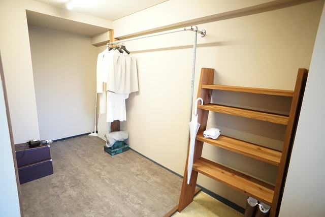 仕事から帰ってきて、玄関へ、玄関からの、ウォークスルークローゼットでコートを脱ぎ捨て、