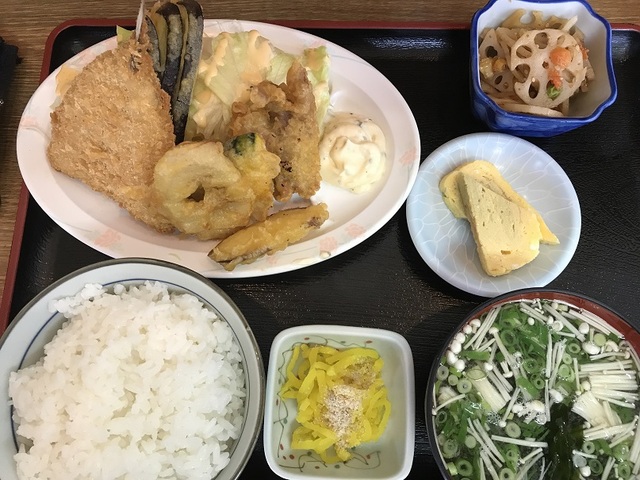 身が分厚いアジフライと、ジューシーな若鳥天ぷら、野菜天ぷらを楽しめました。