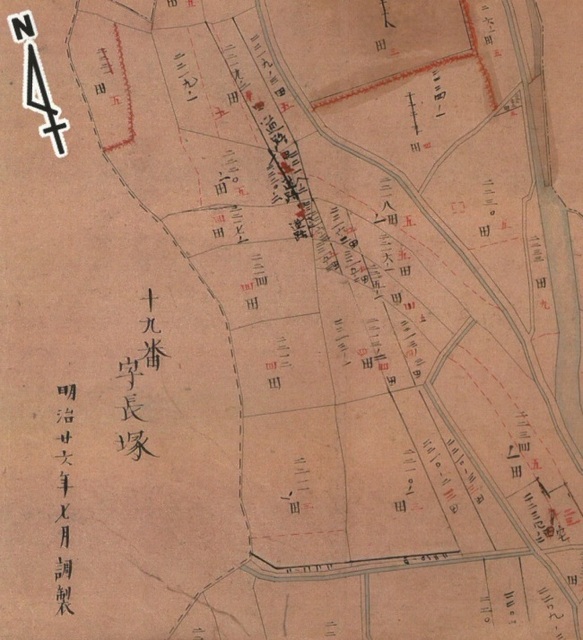 ちなみに写真の旧図の方位は、約90°程度間違って表記されています。