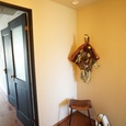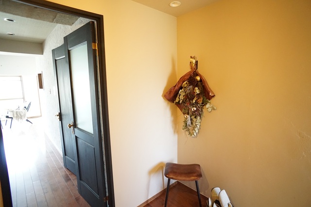 壁、天井は珪藻土、一部クロス 床は無垢フローリング一部クッションフロアー、フロアタイル 無垢の建具