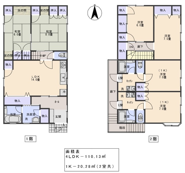 4LDK(和 6・和8 洋6・洋7.5 LDK 14) + 1K×2部屋