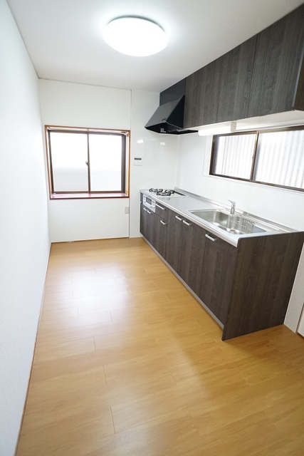 シャワー付洗面化粧台、温水洗浄便座、システムキッチン、3口ガスコンロ、雨戸、追炊き機能バス